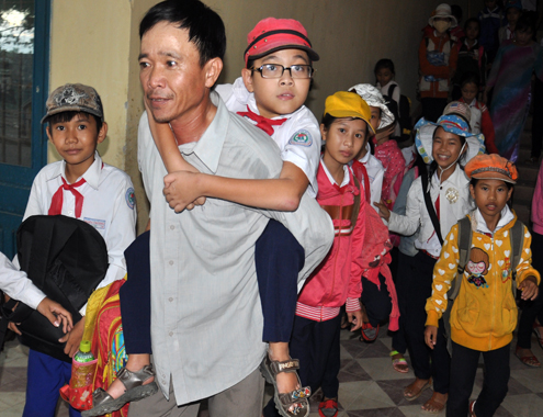 Tạm gác mọi công việc, hàng ngày ông Huynh dành trọn thời gian đưa con ngày hai lượt đến trường và về nhà. Cậu bé càng lớn, lớp học ở trên tầng lầu, ông Huynh oằn lưng cõng con lên xuống cầu thang. Trong khi đó mẹ cậu bé ngày nào cũng thức dậy từ mờ sáng theo các xe tải rong ruổi khắp nơi bưng bê gạch, ngói thuê cho các công trình xây dựng, thu nhập bấp bênh.